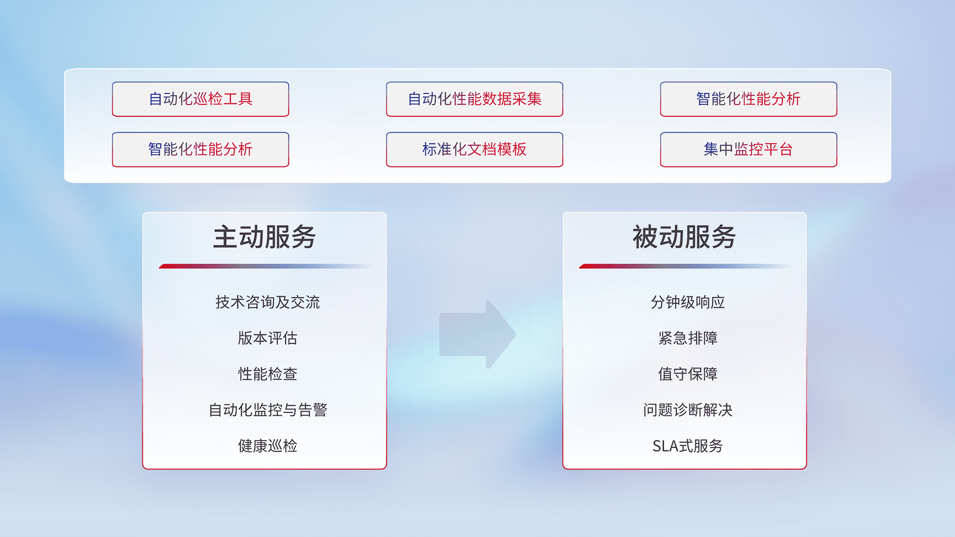 智能化工具和标准化文档,,,保障服务质量,,提供主动服务(包含技术咨询、、版本评估、、性能检查、、、、自动化监控与告警、、、、健康巡检)和被动服务包含(分钟级响应、、、、紧急排障、、值守保障、、、问题诊断解决、、、SLA服务)。。。。