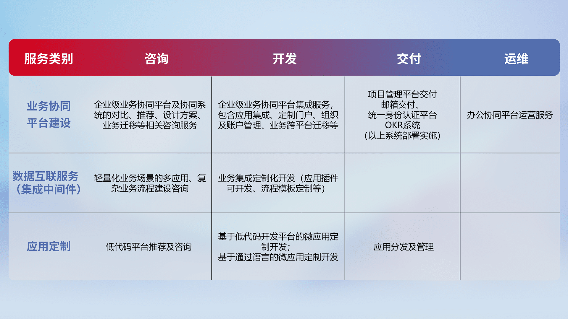 针对钉钉、、企微、、、、IDaas等平台级产品提供产品的规划、、方案、、、、交付、、、定制化开发等服务,,实现如统一协同办公、、、智能客户服务、、、混合会议管理、、、智能数据查询、、、等业务场景,,,实现数字化转型。。。。